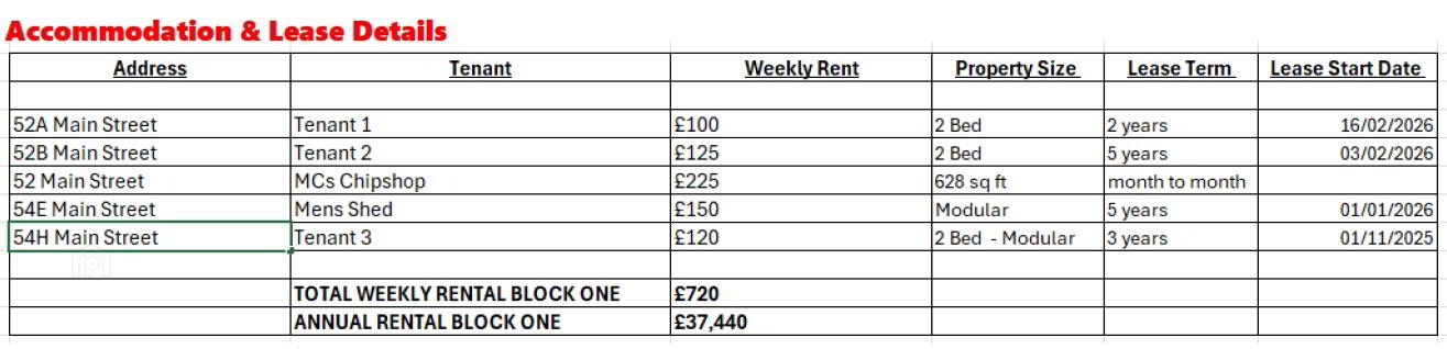 The property comprises of a hot food commercial premises and 2 x 2 bed apartments in the main building and 2 modular properties housing both a commercial and a residential client.
