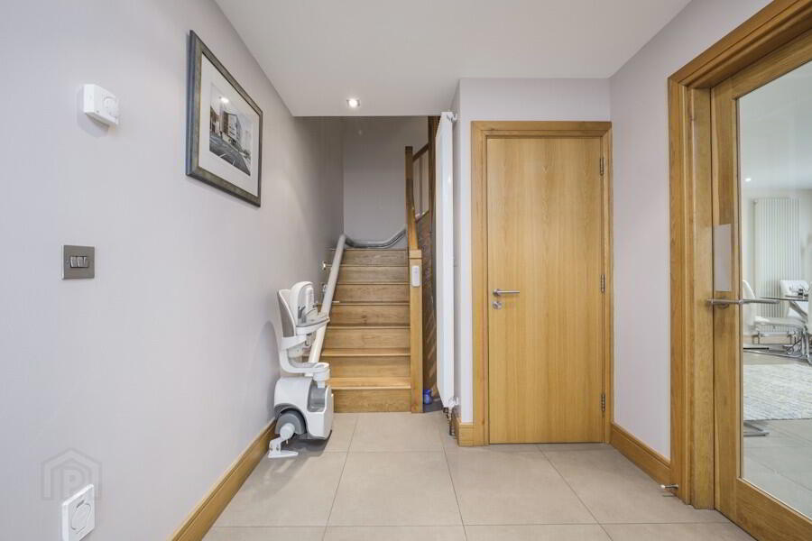 and ceiling and porcelain tiled floor with chair lift.