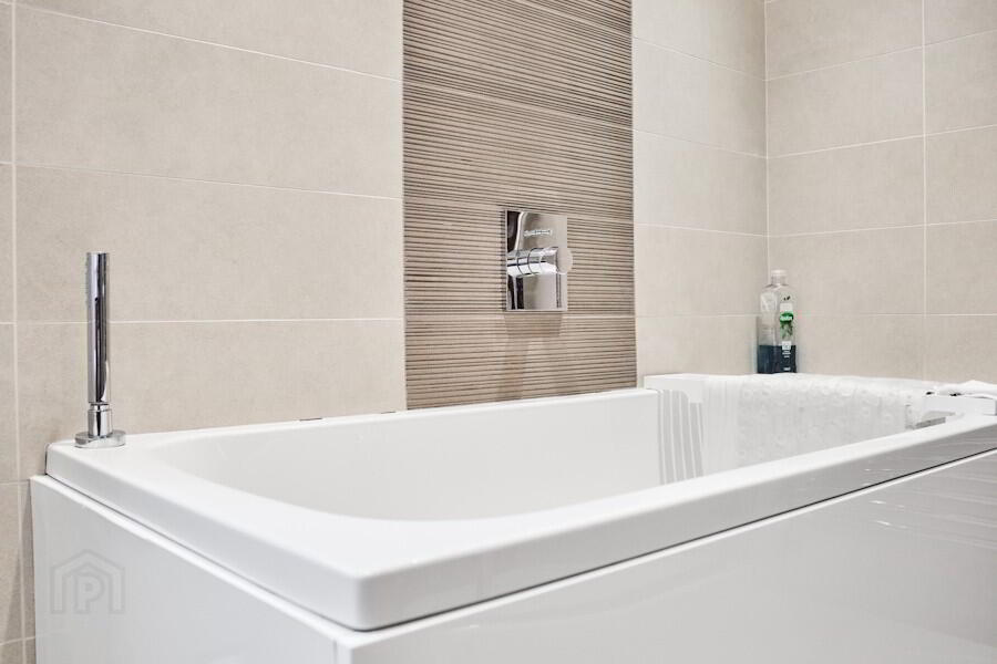 chrome towel rail, extractor fan, Velux window, LED wall