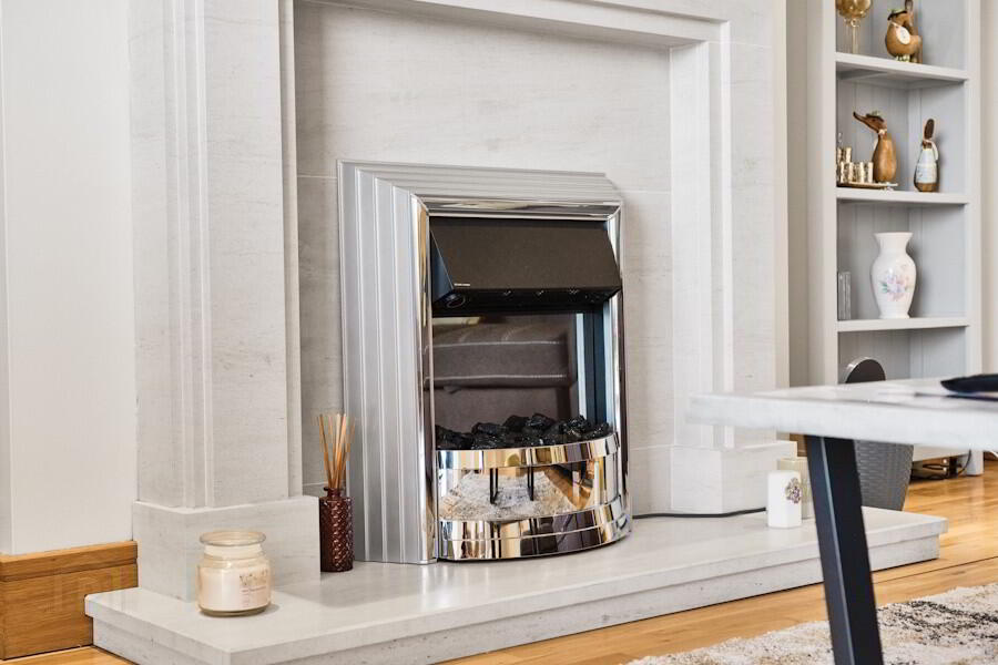 With gas fire set in limestone surround fireplace